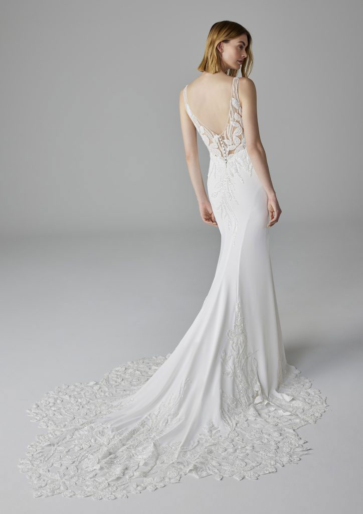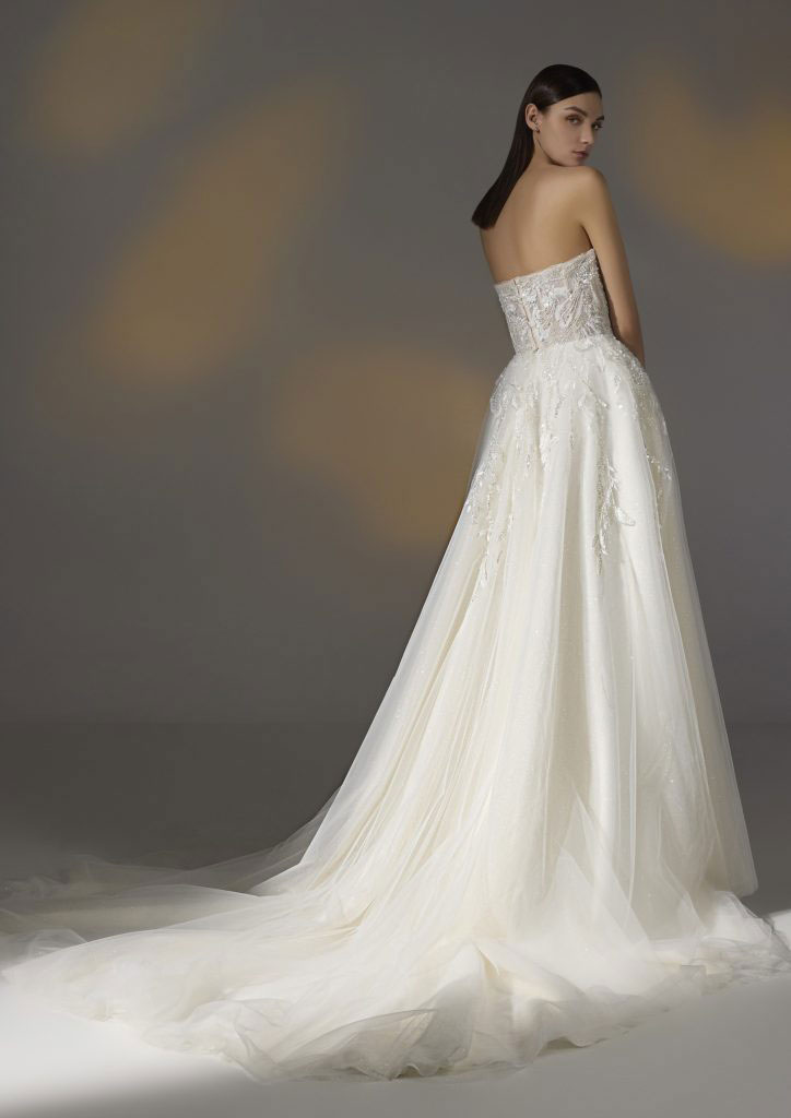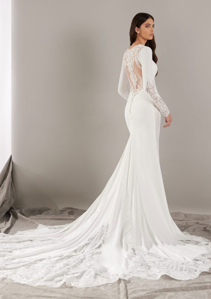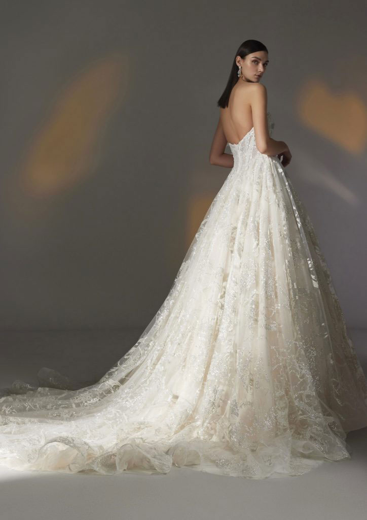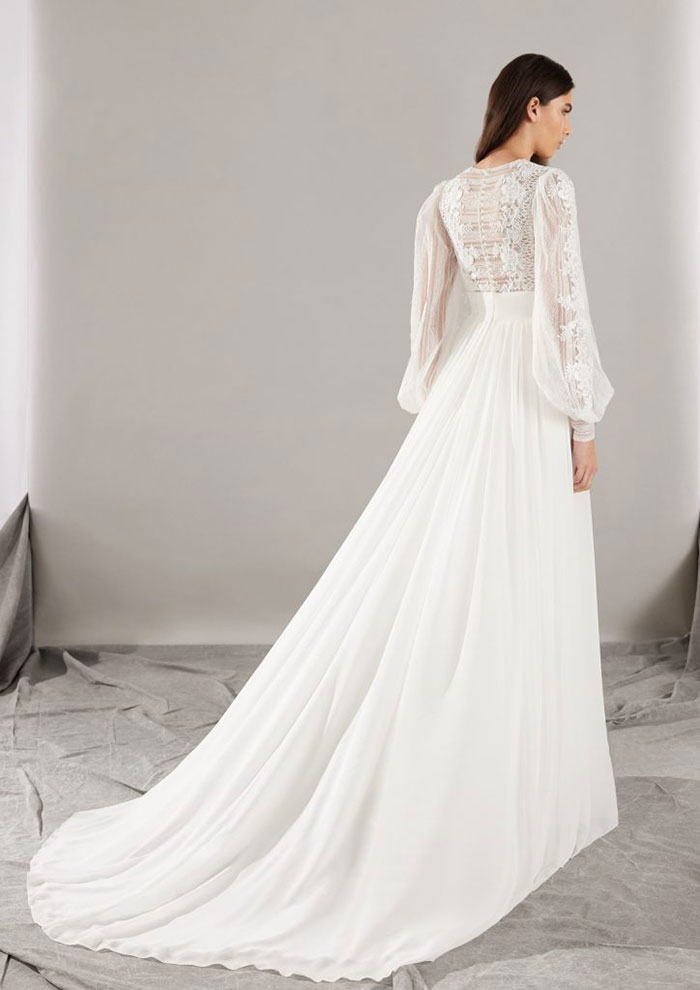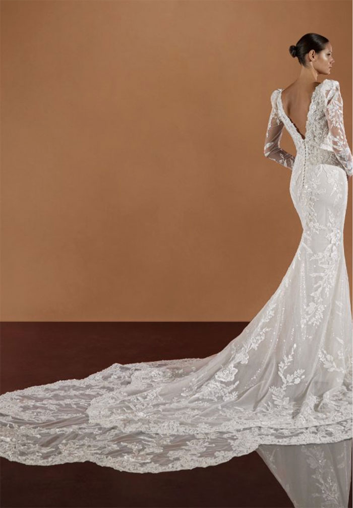 花柄の刺繍で彩られたシアーなロングスリーブが軽やかさを添え、存在感のあるトレーンがドラマティックな印象を演出します。