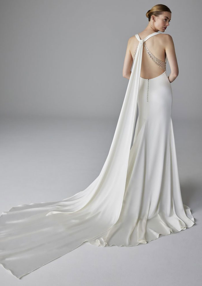 付けると背中の露出を抑えつつ、スカートのトレーンと重なり合うエレガントな着こなしに。